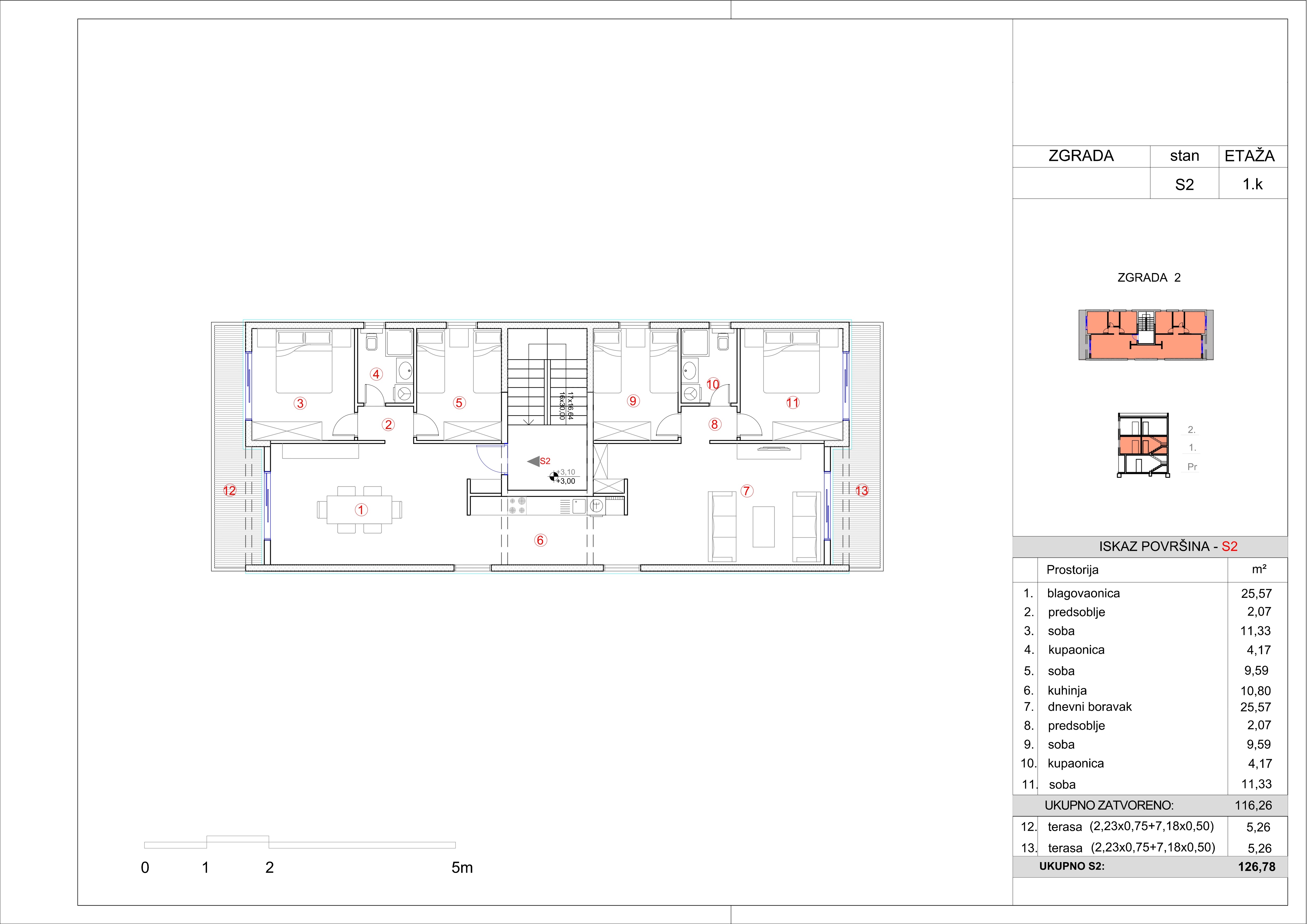 - Stan S2 | 1. kat | 126,78 m2 | Dnevni boravak s kuhinjom i blagovaonicom, 4 spavaće sobe, 2 kupaonice, 2 terase