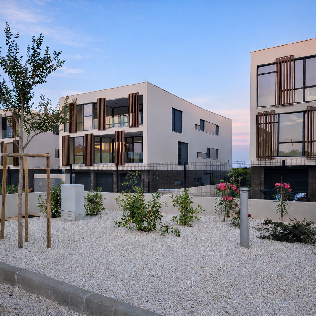 - Uređenje okoliša uključuje travnate površine i mediteransko bilje, dok ambijentalna rasvjeta diskretno naglašava arhitekturu zgrada. Za zajedničke potrebe opskrbe električnom energijom postavljena je fotonaponska elektrana, što omogućuje smanjenje zajedničkih troškova.