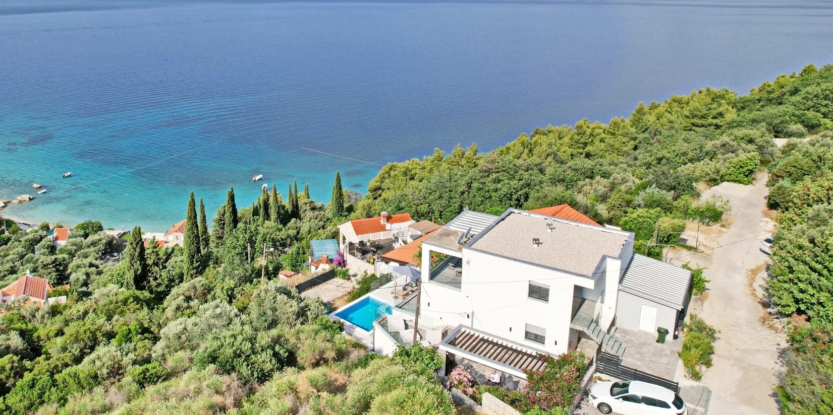 - Smještena na zemljištu cca 370 m2 s kojeg se pruža panoramski pogled na more i otoke